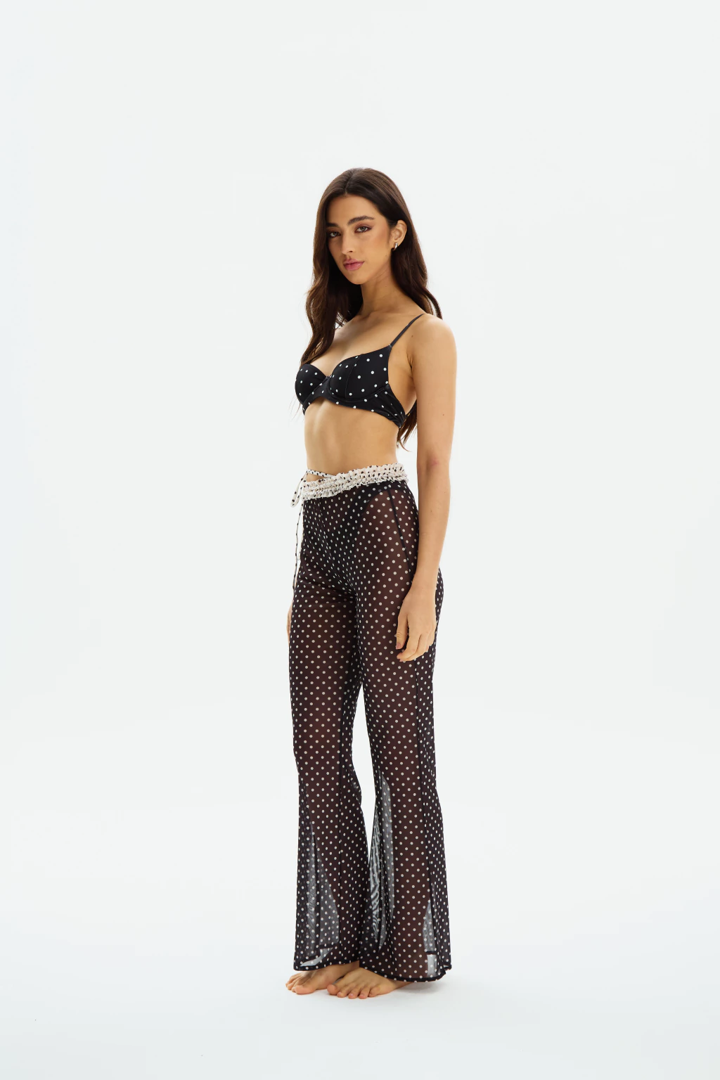 Calça em tule com estampa poá, totalmente transparente. Possui detalhe invertido no cós e fitinha para amarração na cintura. O caimento leve e fluido valoriza o corpo com naturalidade.
